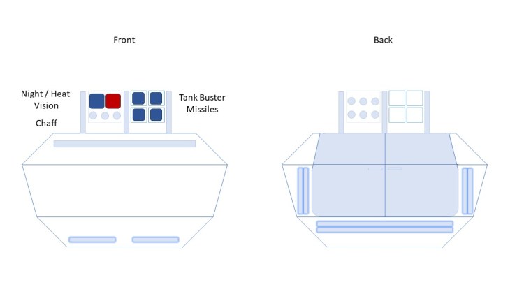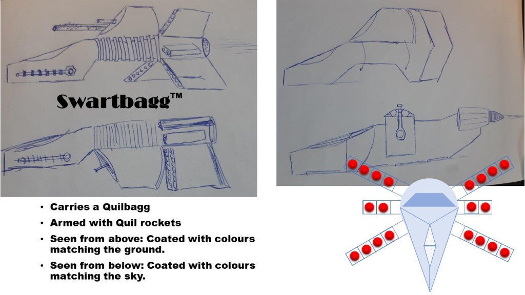 Named after its primary weapon: Quil rockets. The rockets are hidden in “sleeves” at the back when operating as a transportation vehicle. When the Quilbagg is armed, the quil rockets emerge, ready to be fired individually or in a volley.